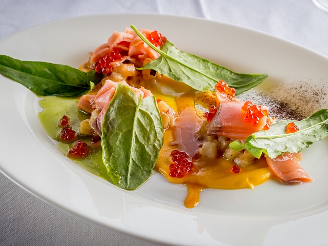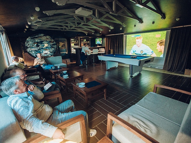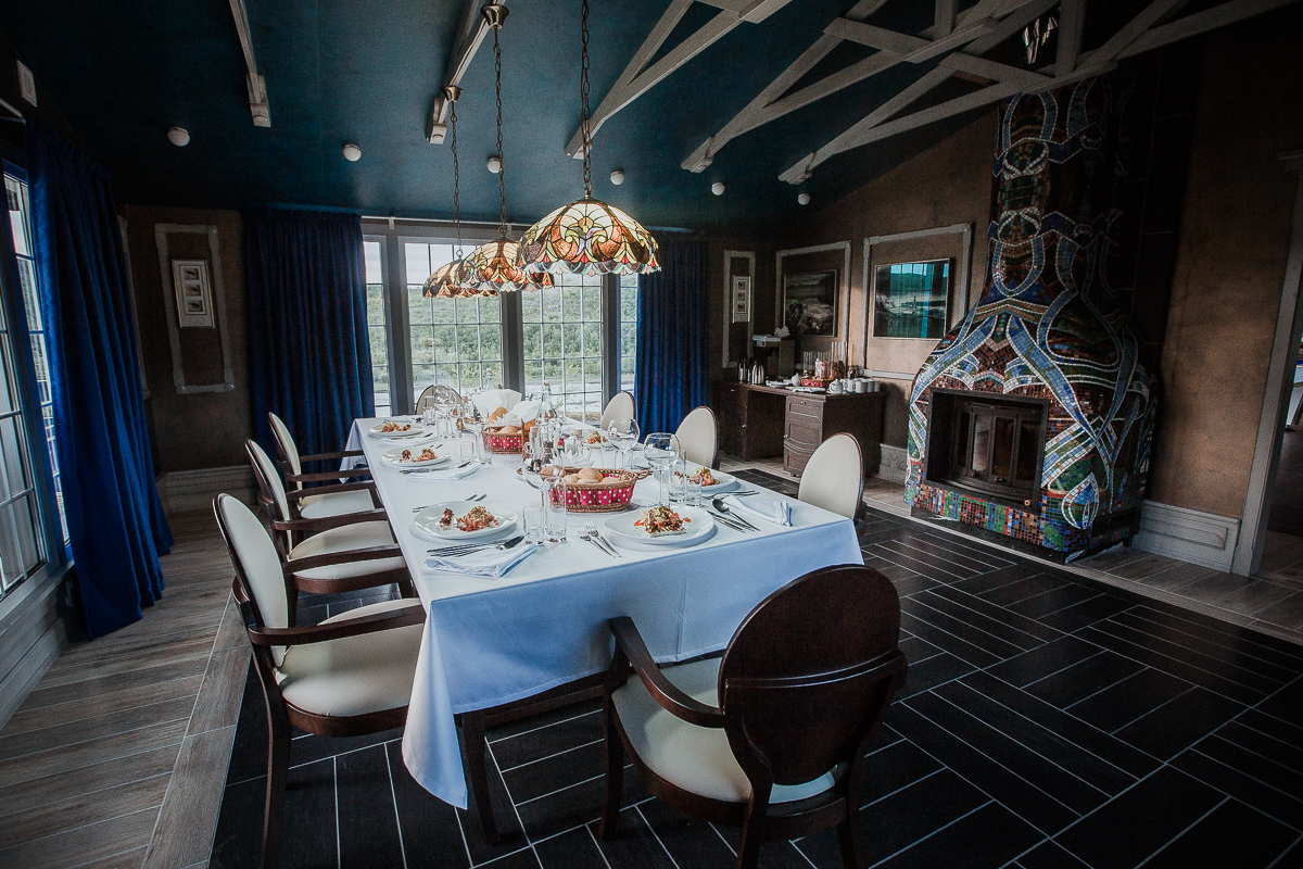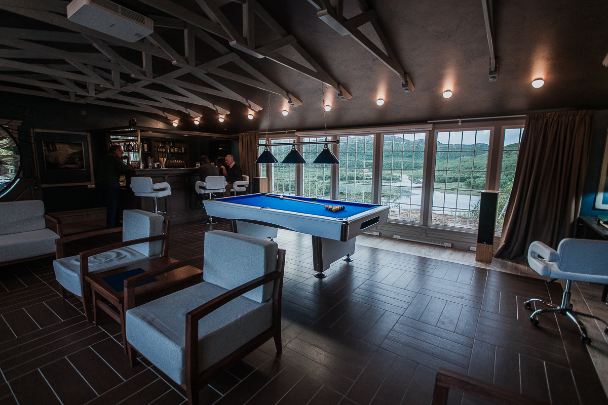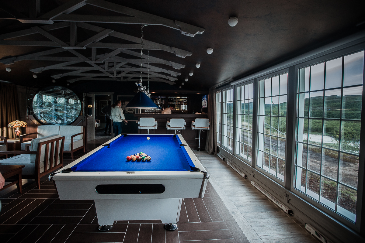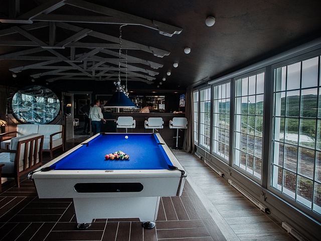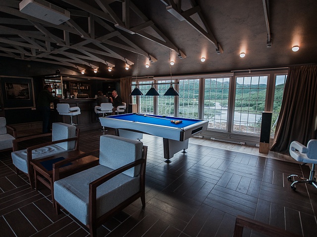 1. The restaurant and lounge bar. The new design a la Nord Art-Nouveau implies an absolutely new vision of the modern fishing lodge interior decoration. Now, guests will have breakfast and dinner savoring dishes of haute cuisine, in a superb dining room with a fireplace and panoramic windows. After dinner they may relax in a spacious lounge bar with a fabulous view of Varzina’s Home pool. There is a great variety of white and red wines, traditional hard liquors, draft beer and a taste collection of single malt Scotch whisky at the bar. The lounge bar can be easily transformed in to a cozy screening room for watching any major sporting events or presentations on a 135» screen with Dolby Digital Surround Sound. Also for billiards fans, there is a full-sized 8-ball pool table. For those who prefer shifting away from the bustle, can get a sense of peace and meditative union with nature on our newly reconstructed charming open patio. It has been designed to be more spacious and more comfortable. It’s a great place to sit for a cup of coffee in the morning or digestive in the evening, whilst watching the jumps of fresh- run springers. If necessary, guests may replenish their fly box or gear at our fly shop. They may also buy some clothes with our logo image, in memory of their trip. Satellite connection and Internet are at guests’ disposal. The lounge bar is equipped with bathroom.
