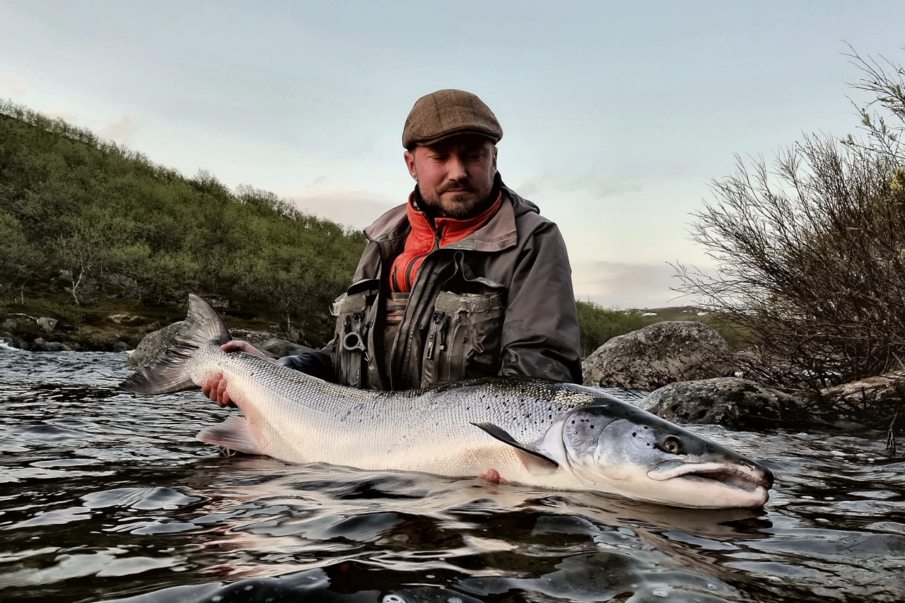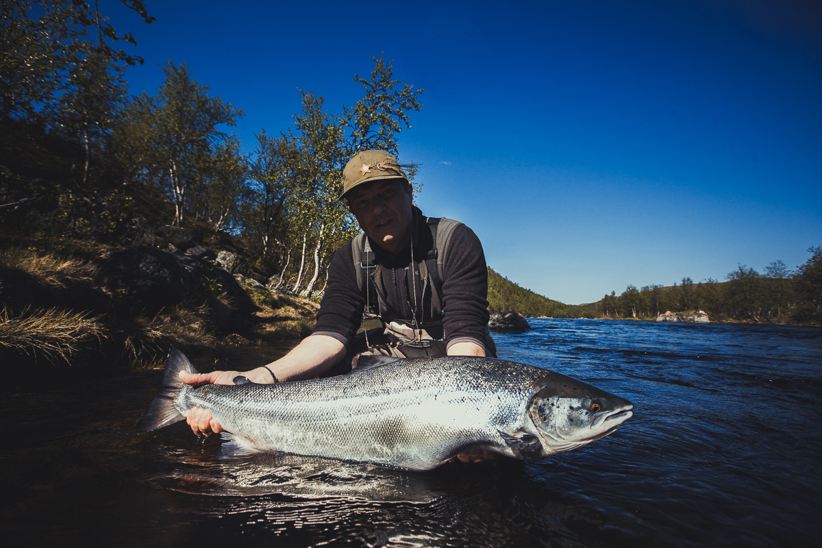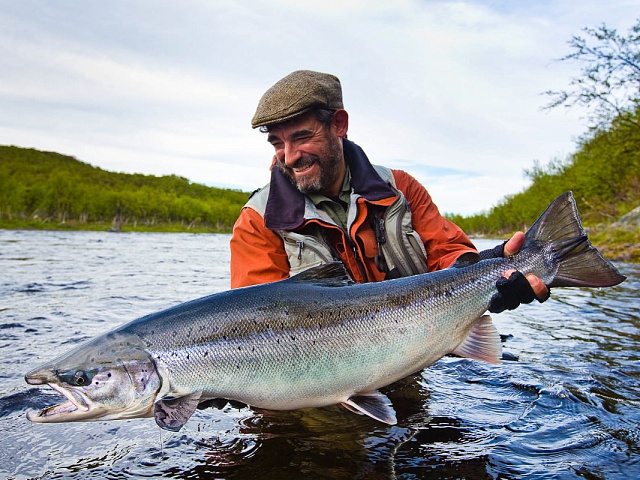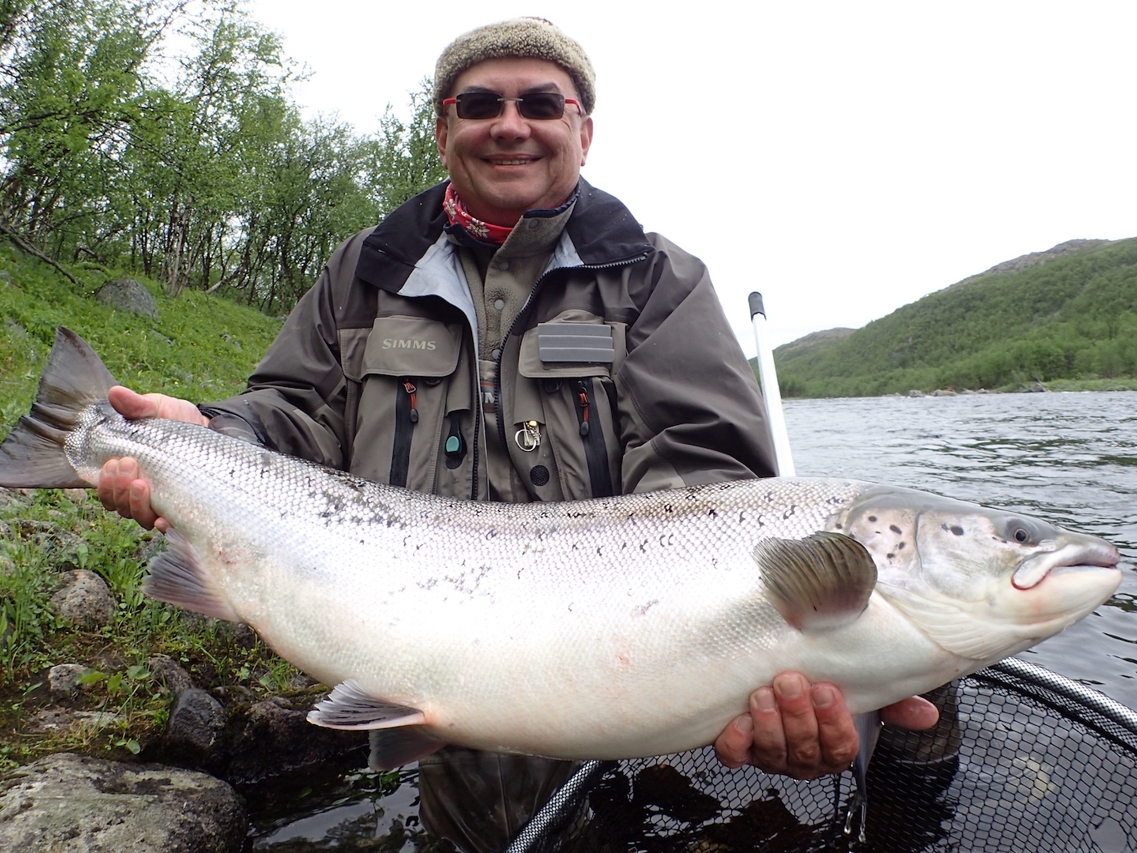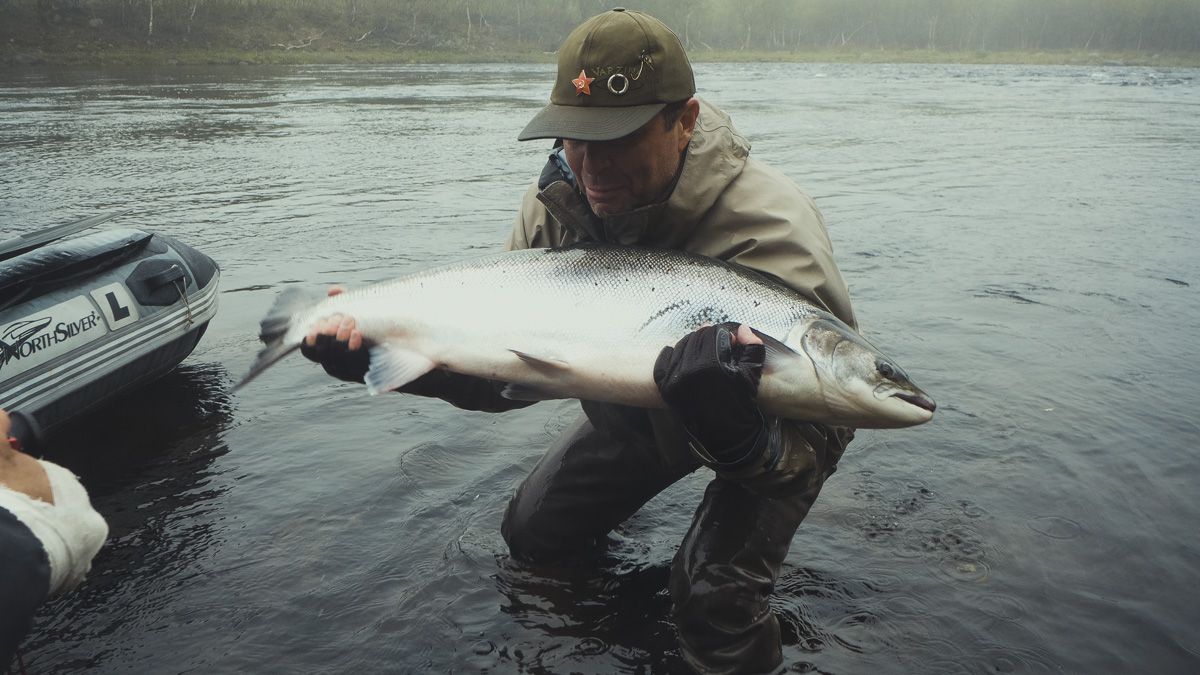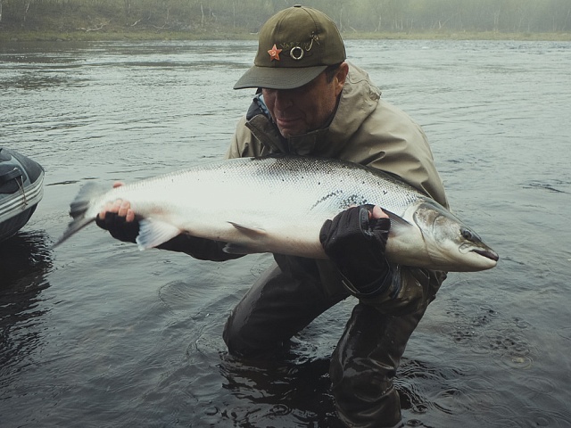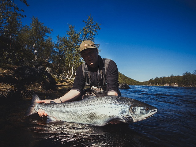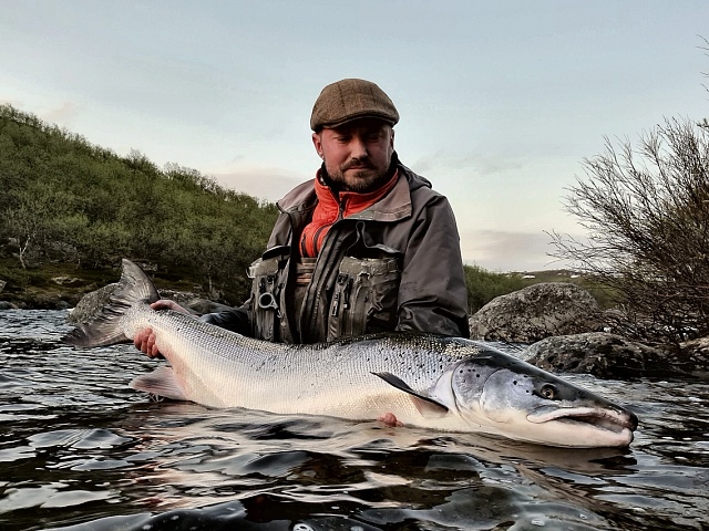 The run of fresh salmon into Varzina usually begins in late May - early June. Nature makes its own adjustments, but at the start of our season, fish is almost always in the river. On average, in a week of high season, about a hundred salmon per group are caught and released. The salmon in June is quite large, so each guest has a real chance of catching a trophy of about 10 kilos. And the lucky ones get a bigger fish every year, well over a meter long. The absolute record of Varzina described is Sir Seton's salmon weighing 59.5lbs (approximately 30 kg).