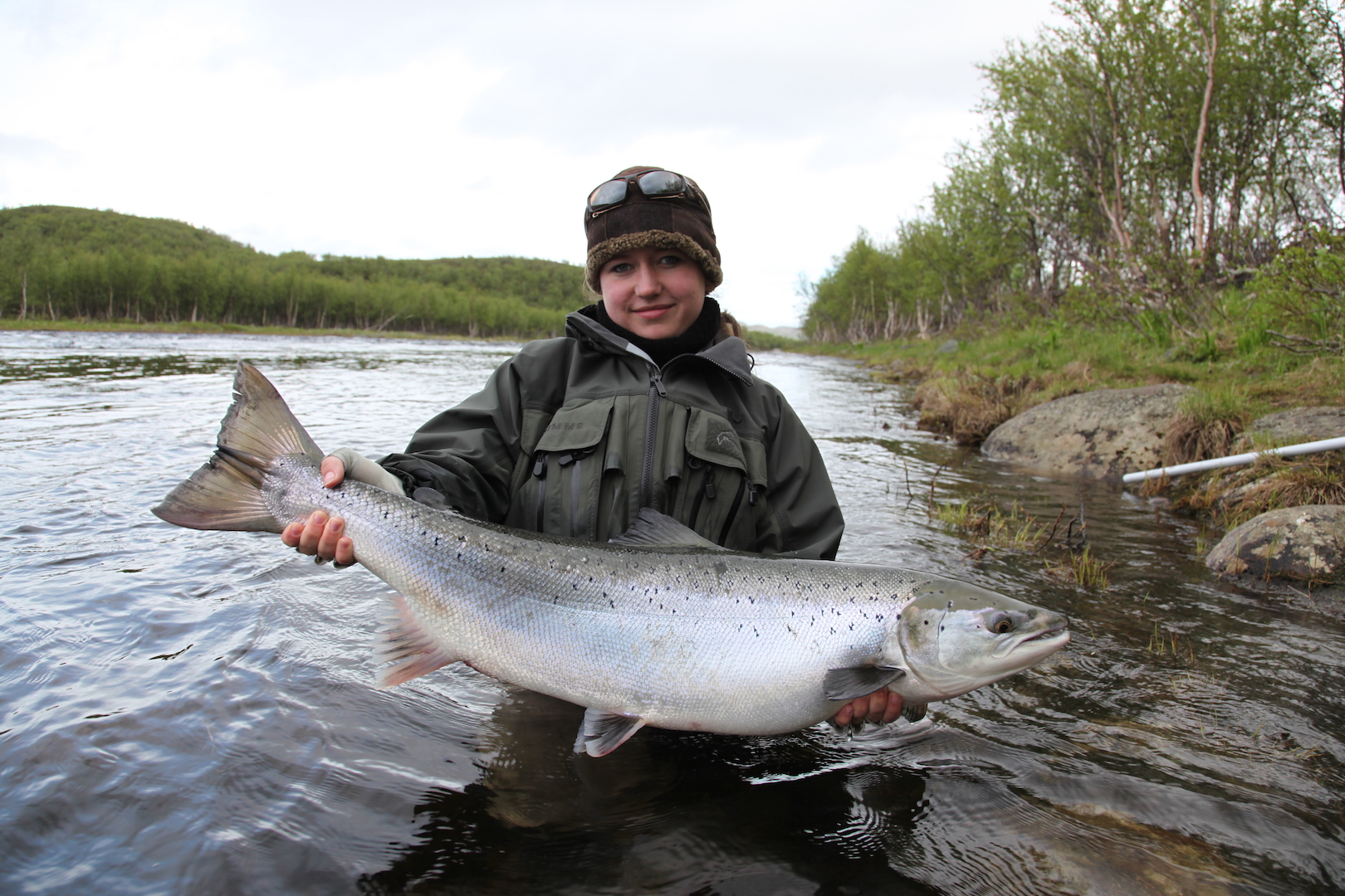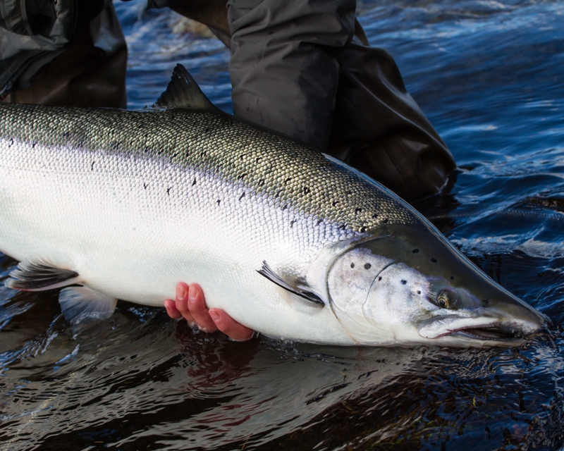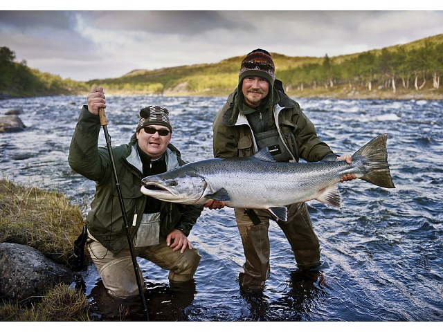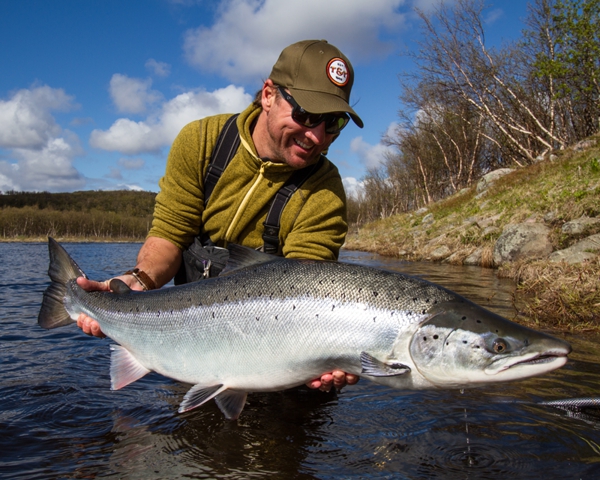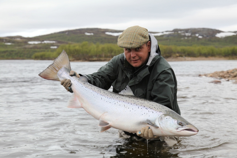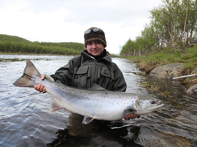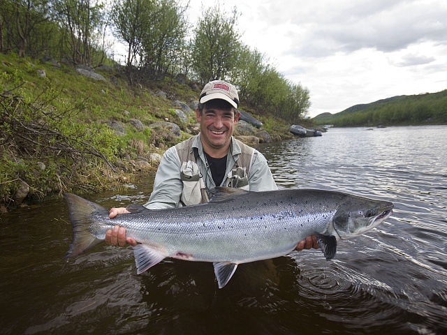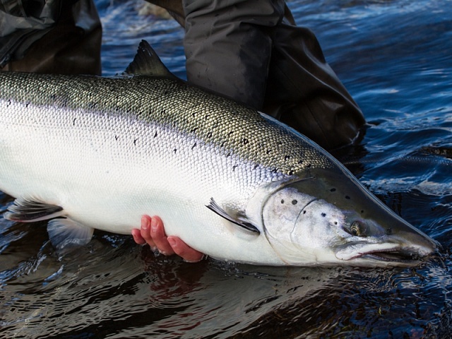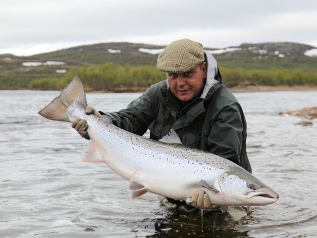 The run of fresh salmon into Varzina usually begins in late May - early June. Nature makes its own adjustments, but at the start of our season, fish is almost always in the river. On average, in a week of high season, about a hundred salmon per group are caught and released. The salmon in June is quite large, so each guest has a real chance of catching a trophy of about 10 kilos. And the lucky ones get a bigger fish every year, well over a meter long. The absolute record of Varzina described is Sir Seton's salmon weighing 59.5lbs (approximately 30 kg).