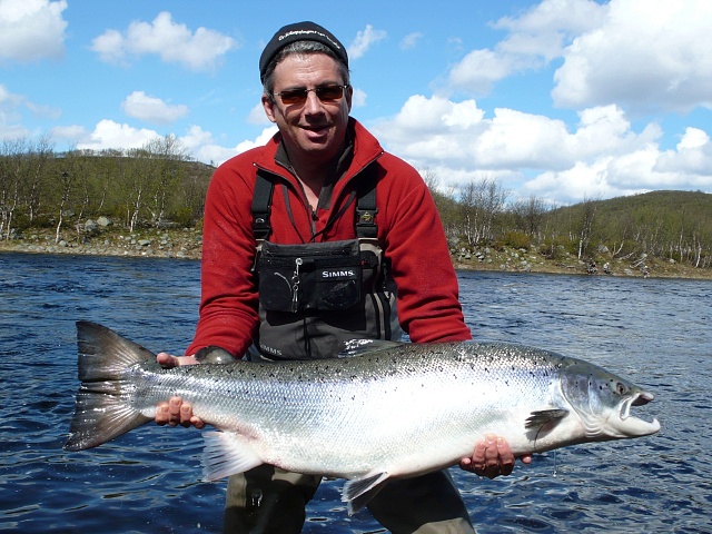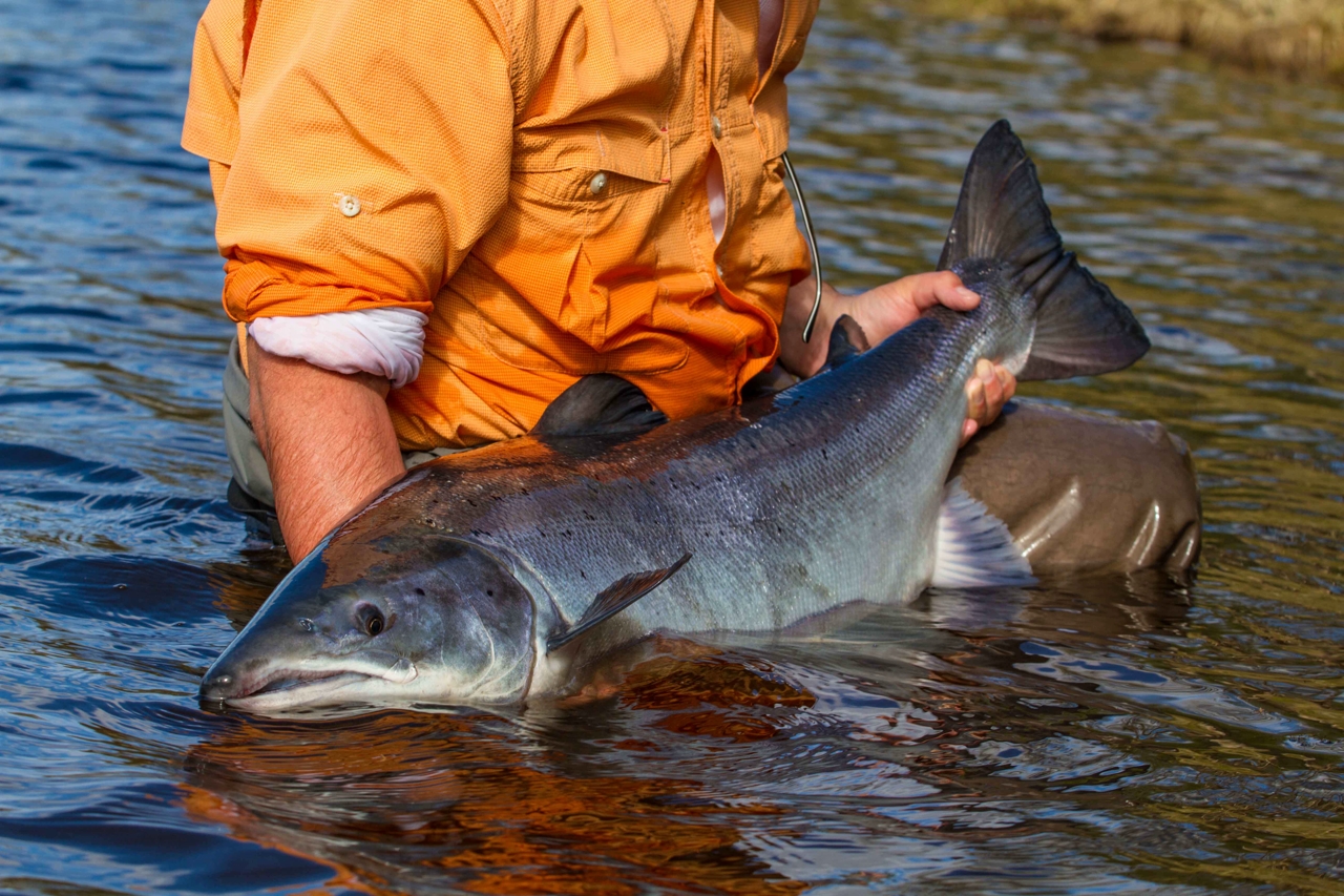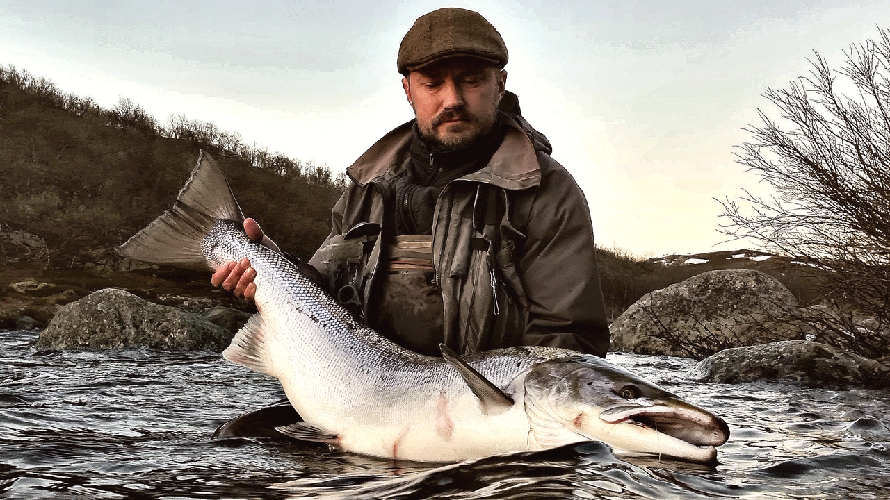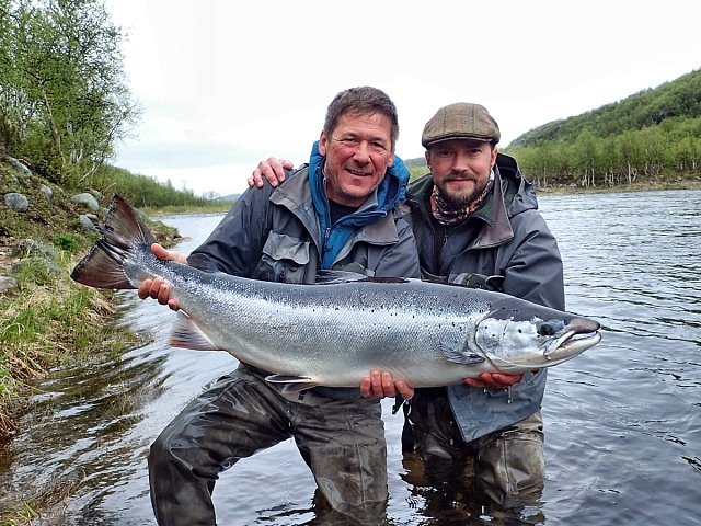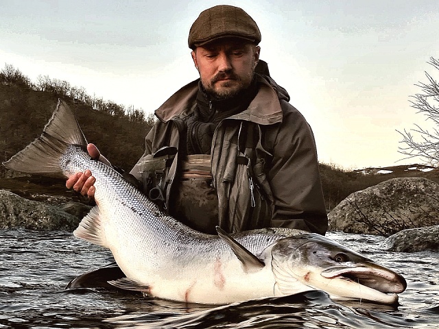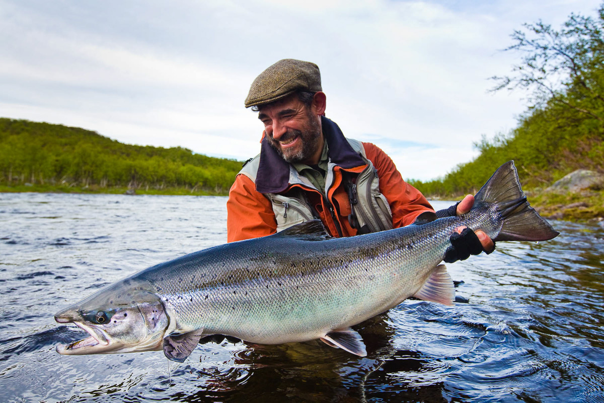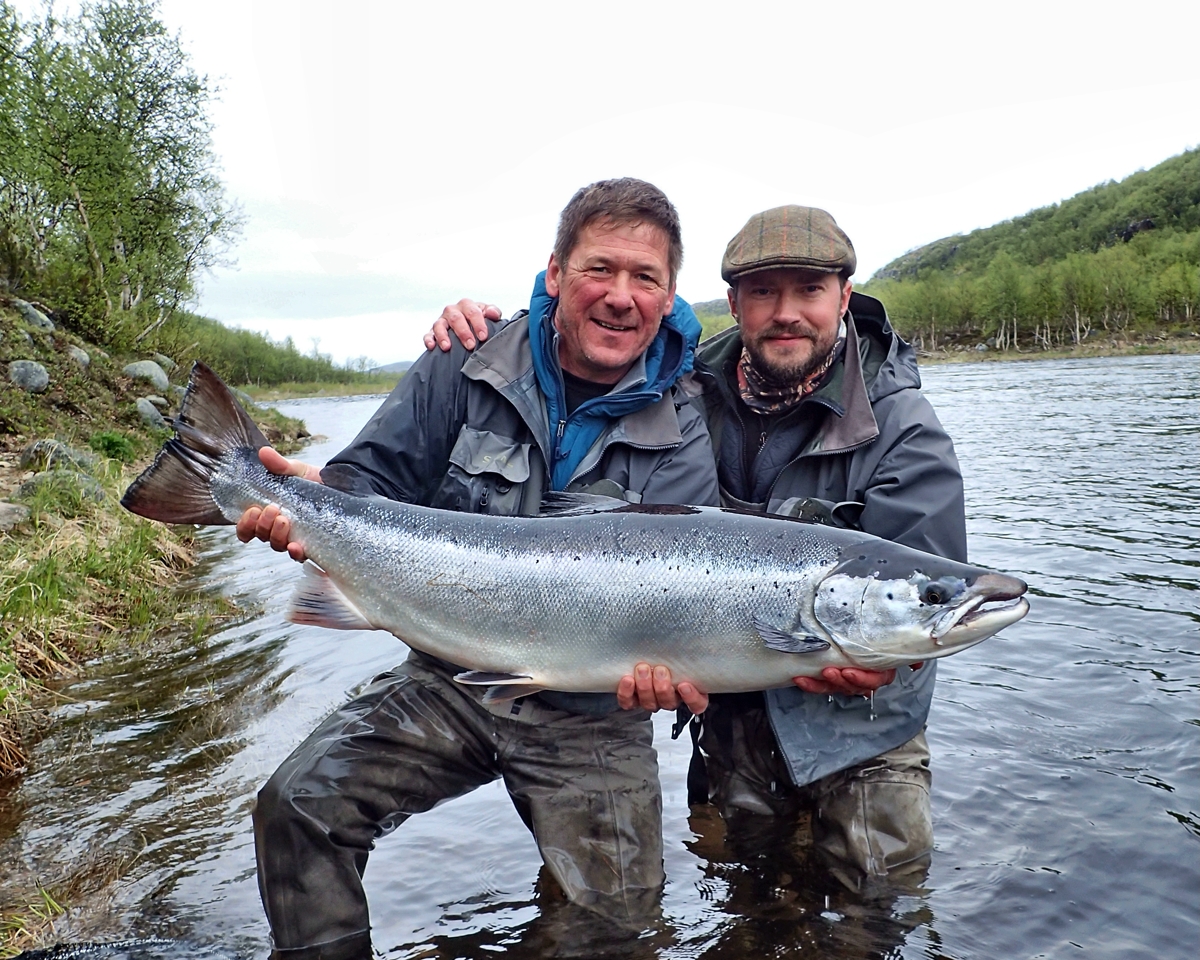 The run of fresh salmon into Varzina usually begins in late May - early June. Nature makes its own adjustments, but at the start of our season, fish is almost always in the river. On average, in a week of high season, about a hundred salmon per group are caught and released. The salmon in June is quite large, so each guest has a real chance of catching a trophy of about 10 kilos. And the lucky ones get a bigger fish every year, well over a meter long. The absolute record of Varzina described is Sir Seton's salmon weighing 59.5lbs (approximately 30 kg).